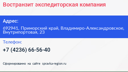 Востранзит, экспедиторская компания по адресу 692941, Приморский край, Владимиро-Александровское, Внутрипортовая, 23 в дальнейшем Организация, размещена в следующих категориях: