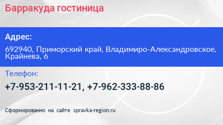Барракуда, гостиница по адресу 692940, Приморский край, Владимиро-Александровское, Крайнева, 6 в дальнейшем Организация, размещена в следующих категориях: