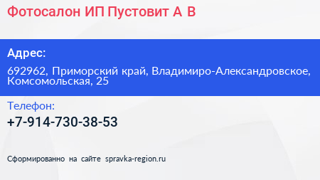 Фотосалон, ИП Пустовит А.В. по адресу 692962, Приморский край, Владимиро-Александровское, Комсомольская, 25 в дальнейшем Организация, размещена в следующих категориях: