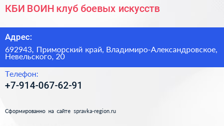 КБИ ВОИН, клуб боевых искусств по адресу 692943, Приморский край, Владимиро-Александровское, Невельского, 20 в дальнейшем Организация, размещена в следующих категориях: