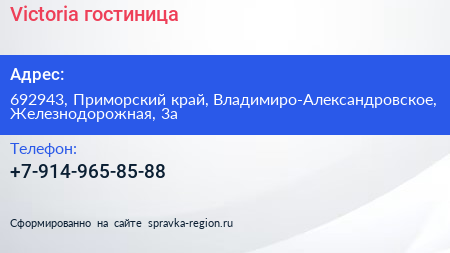 Victoria, гостиница по адресу 692943, Приморский край, Владимиро-Александровское, Железнодорожная, 3а в дальнейшем Организация, размещена в следующих категориях: