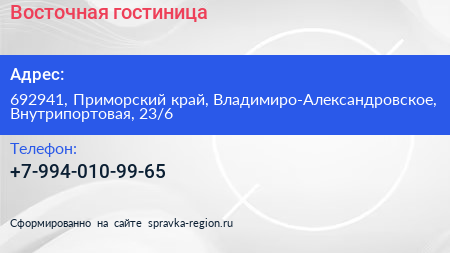 Восточная, гостиница по адресу 692941, Приморский край, Владимиро-Александровское, Внутрипортовая, 23/6 в дальнейшем Организация, размещена в следующих категориях: