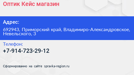 Оптик Кейс, магазин по адресу 692943, Приморский край, Владимиро-Александровское, Невельского, 3 в дальнейшем Организация, размещена в следующих категориях: