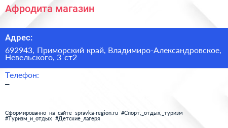 Афродита, магазин по адресу 692943, Приморский край, Владимиро-Александровское, Невельского, 3 ст2 в дальнейшем Организация, размещена в следующих категориях: