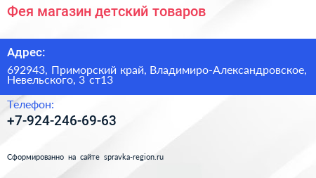 Фея, магазин детский товаров по адресу 692943, Приморский край, Владимиро-Александровское, Невельского, 3 ст13 в дальнейшем Организация, размещена в следующих категориях: