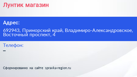 Лунтик, магазин по адресу 692943, Приморский край, Владимиро-Александровское, Восточный проспект, 4 в дальнейшем Организация, размещена в следующих категориях: