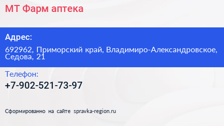 МТ Фарм, аптека по адресу 692962, Приморский край, Владимиро-Александровское, Седова, 21 в дальнейшем Организация, размещена в следующих категориях: