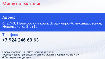 Мишутка, магазин по адресу 692943, Приморский край, Владимиро-Александровское, Невельского, 3 ст12 в дальнейшем Организация, размещена в следующих категориях: