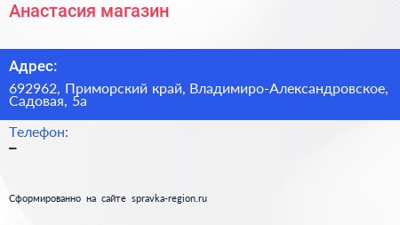 Анастасия, магазин по адресу 692962, Приморский край, Владимиро-Александровское, Садовая, 5а в дальнейшем Организация, размещена в следующих категориях: