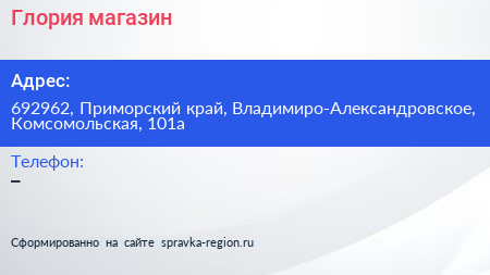 Глория, магазин по адресу 692962, Приморский край, Владимиро-Александровское, Комсомольская, 101а в дальнейшем Организация, размещена в следующих категориях: