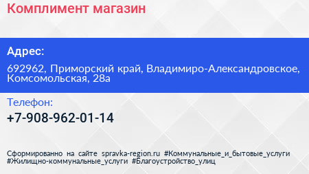 Комплимент, магазин по адресу 692962, Приморский край, Владимиро-Александровское, Комсомольская, 28а в дальнейшем Организация, размещена в следующих категориях: