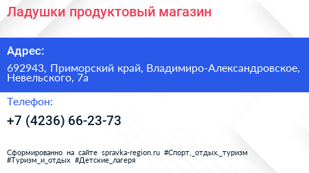 Ладушки, продуктовый магазин по адресу 692943, Приморский край, Владимиро-Александровское, Невельского, 7а в дальнейшем Организация, размещена в следующих категориях: