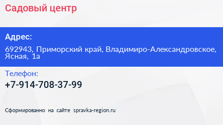 Садовый центр по адресу 692943, Приморский край, Владимиро-Александровское, Ясная, 1а в дальнейшем Организация, размещена в следующих категориях: