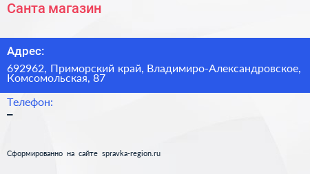 Санта, магазин по адресу 692962, Приморский край, Владимиро-Александровское, Комсомольская, 87 в дальнейшем Организация, размещена в следующих категориях: