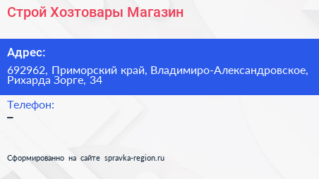 Строй & Хозтовары, Магазин по адресу 692962, Приморский край, Владимиро-Александровское, Рихарда Зорге, 34 в дальнейшем Организация, размещена в следующих категориях:
