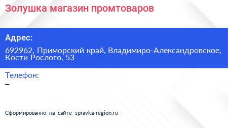 Золушка, магазин промтоваров по адресу 692962, Приморский край, Владимиро-Александровское, Кости Рослого, 53 в дальнейшем Организация, размещена в следующих категориях: