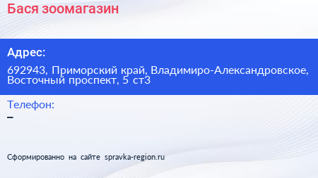 Бася, зоомагазин по адресу 692943, Приморский край, Владимиро-Александровское, Восточный проспект, 5 ст3 в дальнейшем Организация, размещена в следующих категориях: