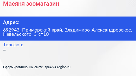 Масяня, зоомагазин по адресу 692943, Приморский край, Владимиро-Александровское, Невельского, 3 ст10 в дальнейшем Организация, размещена в следующих категориях: