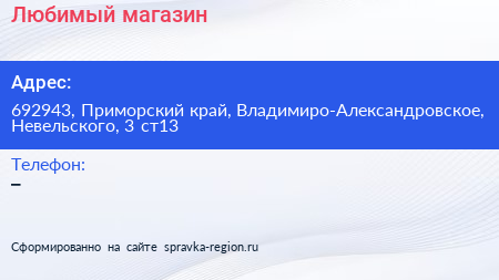 Любимый, магазин по адресу 692943, Приморский край, Владимиро-Александровское, Невельского, 3 ст13 в дальнейшем Организация, размещена в следующих категориях: