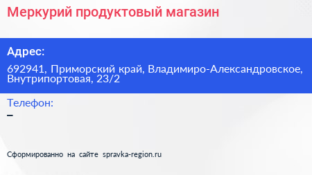 Меркурий, продуктовый магазин по адресу 692941, Приморский край, Владимиро-Александровское, Внутрипортовая, 23/2 в дальнейшем Организация, размещена в следующих категориях: