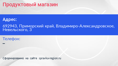 Продуктовый магазин по адресу 692943, Приморский край, Владимиро-Александровское, Невельского, 3 в дальнейшем Организация, размещена в следующих категориях: