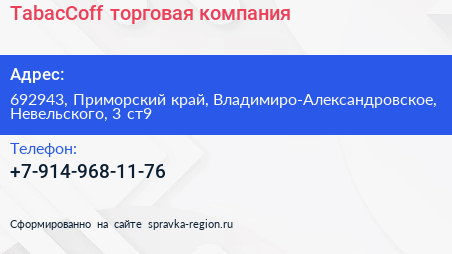 TabaсCoff, торговая компания по адресу 692943, Приморский край, Владимиро-Александровское, Невельского, 3 ст9 в дальнейшем Организация, размещена в следующих категориях: