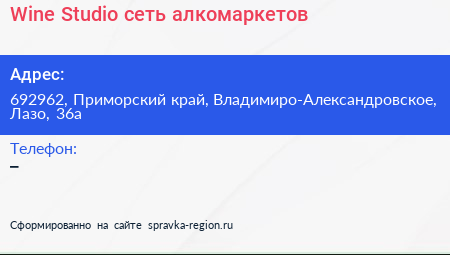 Wine Studio, сеть алкомаркетов по адресу 692962, Приморский край, Владимиро-Александровское, Лазо, 36а в дальнейшем Организация, размещена в следующих категориях: