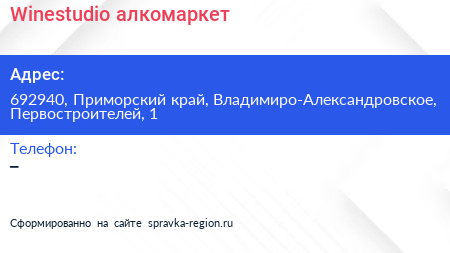 Winestudio, алкомаркет по адресу 692940, Приморский край, Владимиро-Александровское, Первостроителей, 1 в дальнейшем Организация, размещена в следующих категориях: