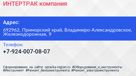 ИНТЕРТРАК, компания по адресу 692962, Приморский край, Владимиро-Александровское, Железнодорожная, 9 в дальнейшем Организация, размещена в следующих категориях: