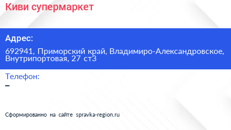 Киви, супермаркет по адресу 692941, Приморский край, Владимиро-Александровское, Внутрипортовая, 27 ст3 в дальнейшем Организация, размещена в следующих категориях: