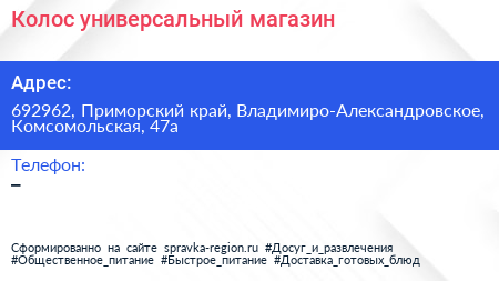 Колос, универсальный магазин по адресу 692962, Приморский край, Владимиро-Александровское, Комсомольская, 47а в дальнейшем Организация, размещена в следующих категориях: