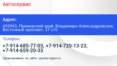 Автосервис по адресу 692943, Приморский край, Владимиро-Александровское, Восточный проспект, 17 ст5 в дальнейшем Организация, размещена в следующих категориях: