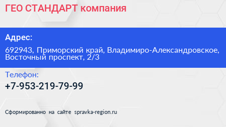ГЕО-СТАНДАРТ, компания по адресу 692943, Приморский край, Владимиро-Александровское, Восточный проспект, 2/3 в дальнейшем Организация, размещена в следующих категориях: