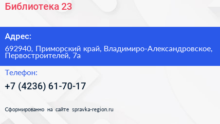 Библиотека №23 по адресу 692940, Приморский край, Владимиро-Александровское, Первостроителей, 7а в дальнейшем Организация, размещена в следующих категориях: