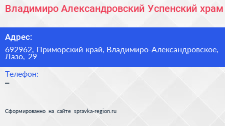Владимиро-Александровский Успенский храм по адресу 692962, Приморский край, Владимиро-Александровское, Лазо, 29 в дальнейшем Организация, размещена в следующих категориях: