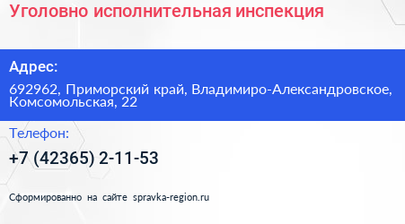 Уголовно-исполнительная инспекция по адресу 692962, Приморский край, Владимиро-Александровское, Комсомольская, 22 в дальнейшем Организация, размещена в следующих категориях: