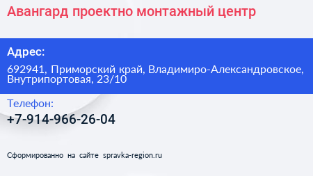 Авангард, проектно-монтажный центр по адресу 692941, Приморский край, Владимиро-Александровское, Внутрипортовая, 23/10 в дальнейшем Организация, размещена в следующих категориях: