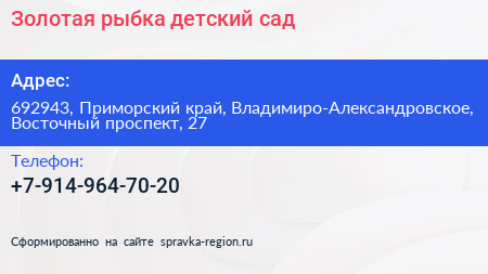 Золотая рыбка, детский сад по адресу 692943, Приморский край, Владимиро-Александровское, Восточный проспект, 27 в дальнейшем Организация, размещена в следующих категориях: