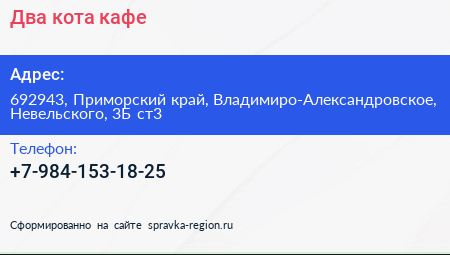 Два кота, кафе по адресу 692943, Приморский край, Владимиро-Александровское, Невельского, 3Б ст3 в дальнейшем Организация, размещена в следующих категориях: