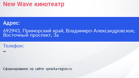 New Wave, кинотеатр по адресу 692943, Приморский край, Владимиро-Александровское, Восточный проспект, 3а в дальнейшем Организация, размещена в следующих категориях: