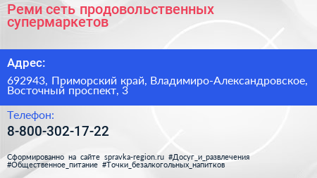 Реми, сеть продовольственных супермаркетов по адресу 692943, Приморский край, Владимиро-Александровское, Восточный проспект, 3 в дальнейшем Организация, размещена в следующих категориях: