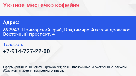 Уютное местечко, кофейня по адресу 692943, Приморский край, Владимиро-Александровское, Восточный проспект, 4 в дальнейшем Организация, размещена в следующих категориях: