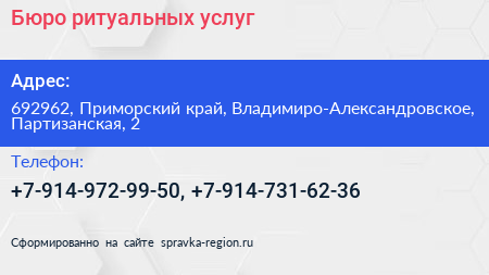 Бюро ритуальных услуг по адресу 692962, Приморский край, Владимиро-Александровское, Партизанская, 2 в дальнейшем Организация, размещена в следующих категориях: