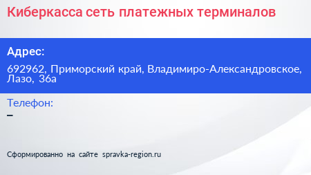 Киберкасса, сеть платежных терминалов по адресу 692962, Приморский край, Владимиро-Александровское, Лазо, 36а в дальнейшем Организация, размещена в следующих категориях:
