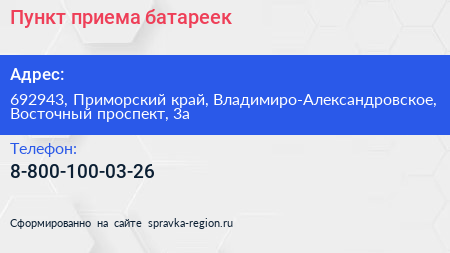 Пункт приема батареек по адресу 692943, Приморский край, Владимиро-Александровское, Восточный проспект, 3а в дальнейшем Организация, размещена в следующих категориях:
