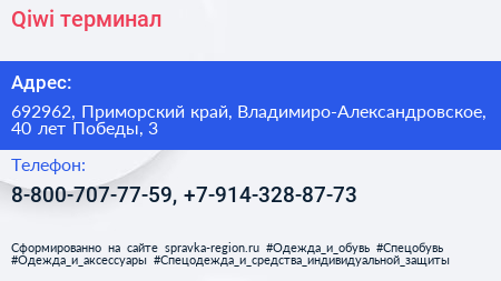 Qiwi, терминал по адресу 692962, Приморский край, Владимиро-Александровское, 40 лет Победы, 3 в дальнейшем Организация, размещена в следующих категориях:
