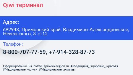 Qiwi, терминал по адресу 692943, Приморский край, Владимиро-Александровское, Невельского, 3 ст12 в дальнейшем Организация, размещена в следующих категориях: