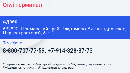Qiwi, терминал по адресу 692940, Приморский край, Владимиро-Александровское, Первостроителей, 6 ст2 в дальнейшем Организация, размещена в следующих категориях: