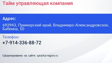Тайм, управляющая компания по адресу 692943, Приморский край, Владимиро-Александровское, Бабкина, 10 в дальнейшем Организация, размещена в следующих категориях: