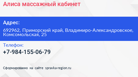 Алиса, массажный кабинет по адресу 692962, Приморский край, Владимиро-Александровское, Комсомольская, 25 в дальнейшем Организация, размещена в следующих категориях: